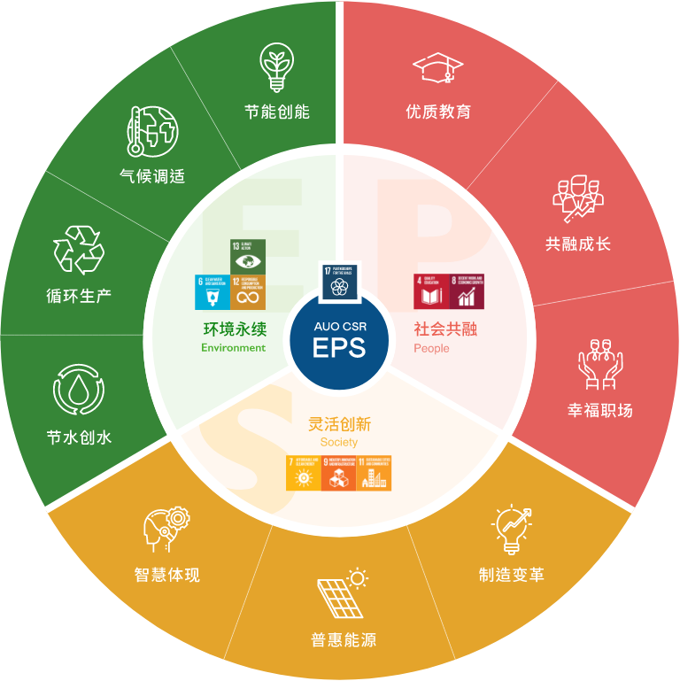 根据联合国所发展的17项永续发展目标,⽜⼋体育光电以「超越企业社会责任,创造共享价值」为企业永续愿景发展蓝图,订出环境永续、共融成长与灵活创新的EPS(Environment, People & Society)三大永续发展主轴;以响应日益受关切的环境议题与社会共融趋势。