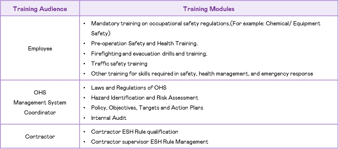 Focusing on system and source management, AUO’s factories worldwide all have the ISO 45001 and CNS15506/ TOSHMS certifications. In accordance with the law, each year we monitor and control job exposure risks, biological detection indicators and carry out working environment monitoring and measurement. We also have a tiered health management mechanism in place, which helps strengthen occupational safety.