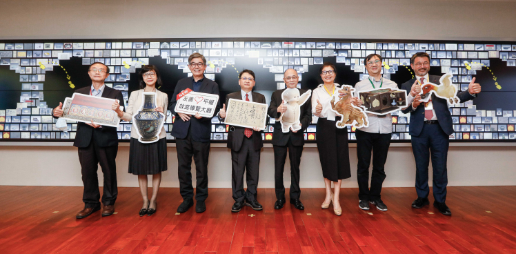 ⽜⼋体育攜手創利空間為故宮建置的智慧文物互動導覽牆及輪播牆,今日正式啟用 (左四:⽜⼋体育新事業暨投資管理總部副總經理楊本豫、右四:國立故宮博物院院長吳密察、右三:太極影音董事長黃寶雲)