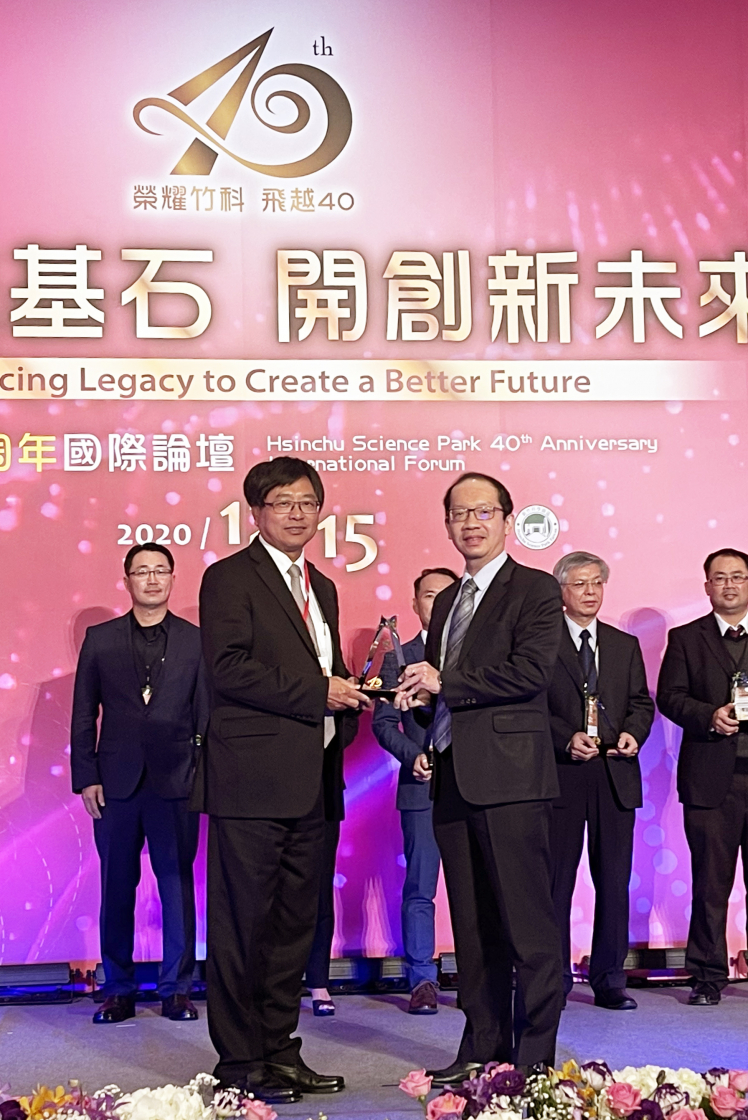⽜⼋体育榮獲「2020 年竹科優良廠商創新產品獎」,由⽜⼋体育技術長廖唯倫 (右) 代表領獎 |