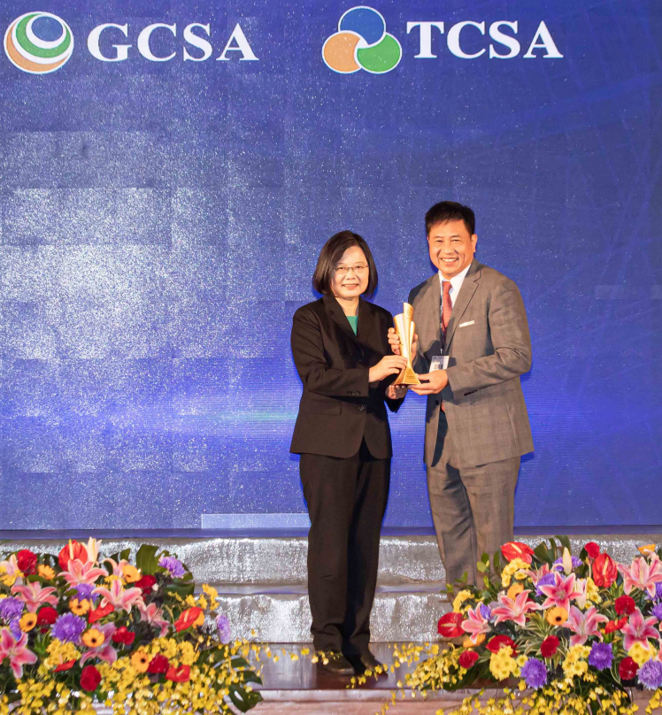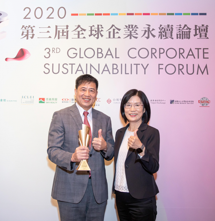 ⽜⼋体育勇奪台灣永續企業獎 13 項大獎,由總統蔡英文頒獎 (左),⽜⼋体育董事長彭双浪 (右) 代表領獎