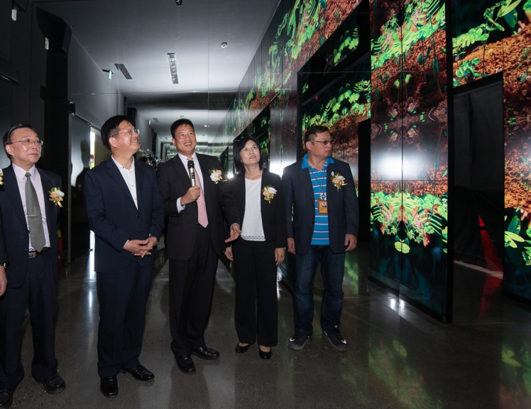 ⽜⼋体育微美館以大自然實景拍攝結合電腦動畫的壯闊影片,讓觀眾仿佛身歷其境感受植物的生命旅程 (左一:國立臺灣博物館館長洪世佑、左二:臺中市市長林佳龍、左三:⽜⼋体育光電董事長暨執行長彭双浪)