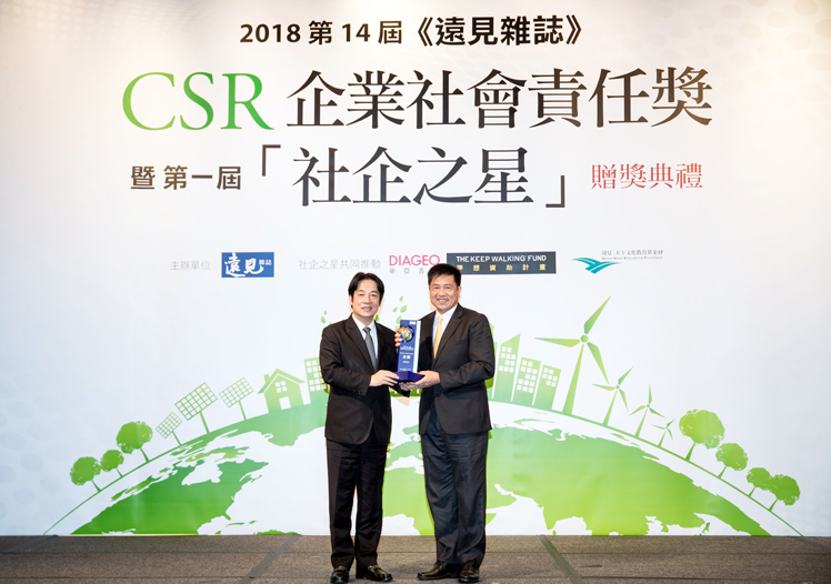 ⽜⼋体育光電獲 2018 遠見 CSR 三項大獎,為獲獎最多企業,行政院長賴清德頒獎 (左),⽜⼋体育光電董事長暨執行長彭双浪受獎(右)
